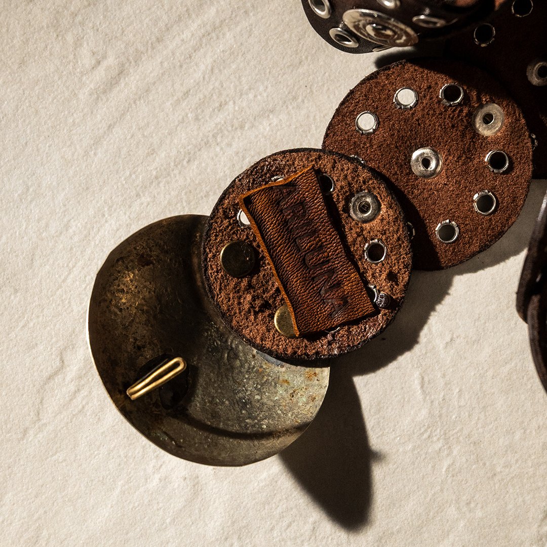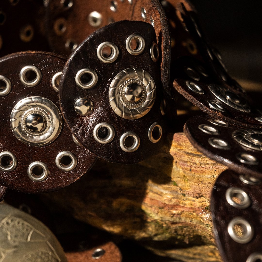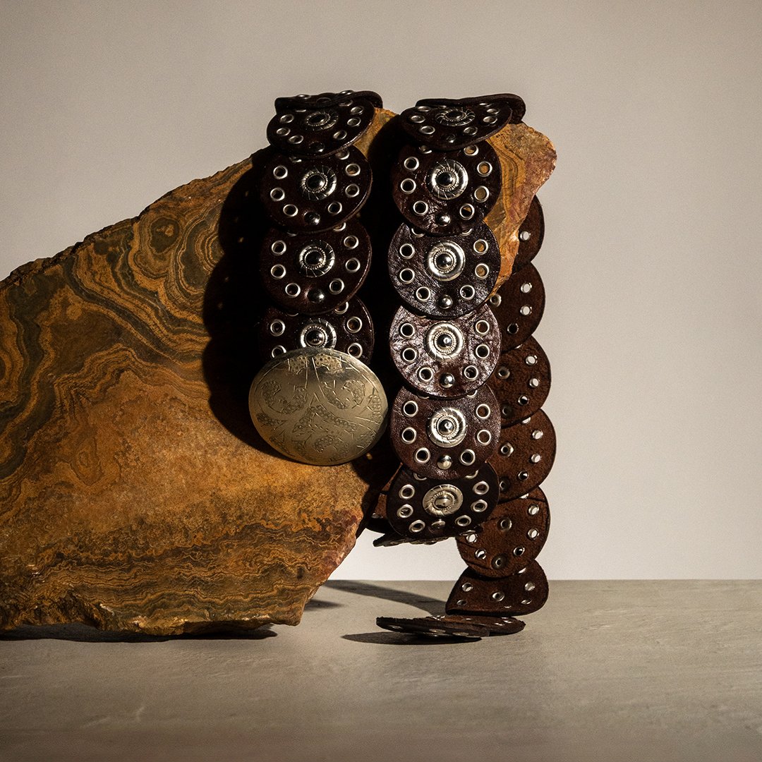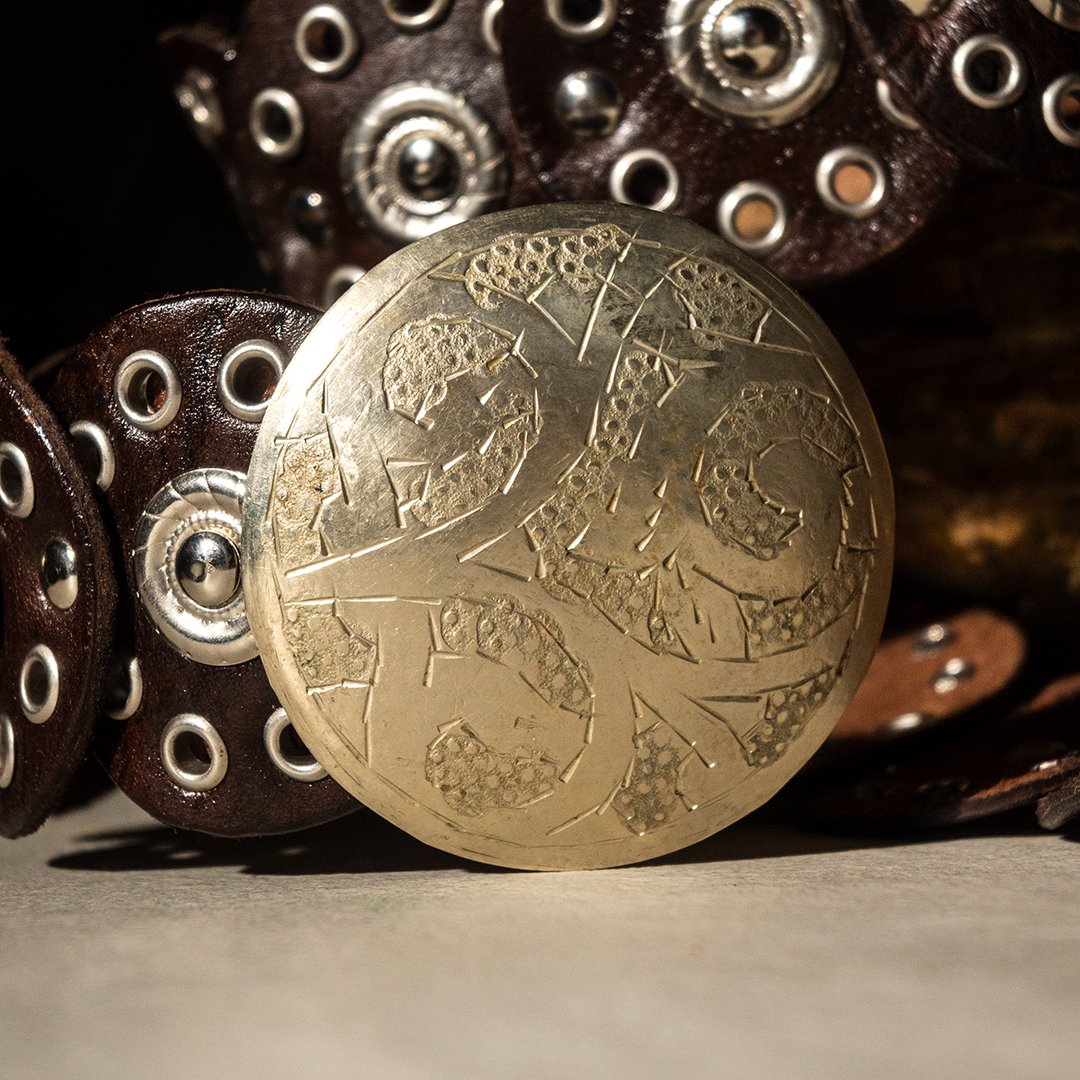 Handcrafted natural leather belt featuring a bold design and contemporary Western style. The band is composed of a series of hand-cut and hand-crafted leather elements, joined by metal studs that create a sophisticated and distinctive pattern. The round buckle, also hand-crafted, features decorative engravings that recall the aesthetic of concho belts typical of Western craftsmanship.