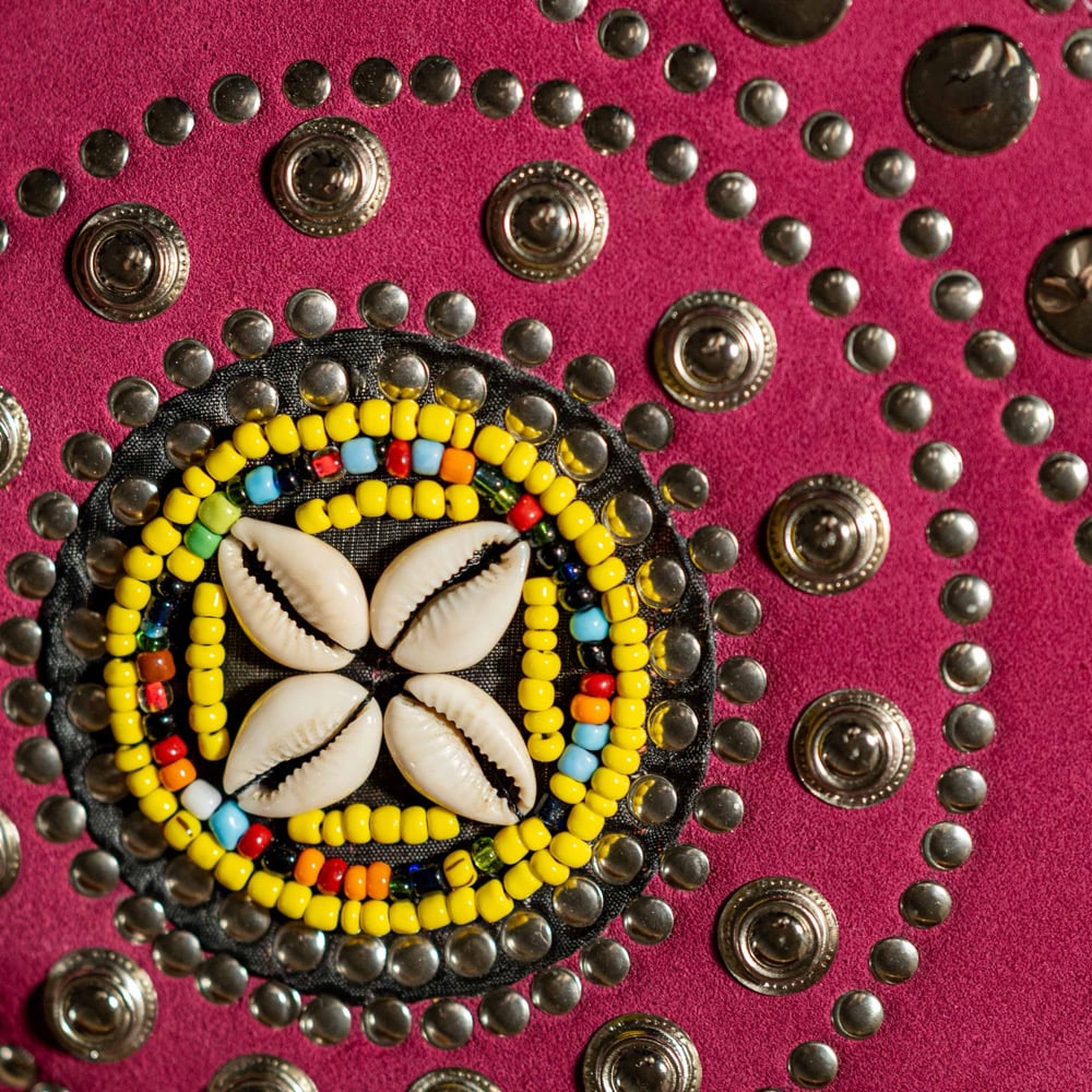 Each piece is embellished with a handcrafted central rosette, combining colorful beads and genuine shells, creating a unique highlight on the front flap.