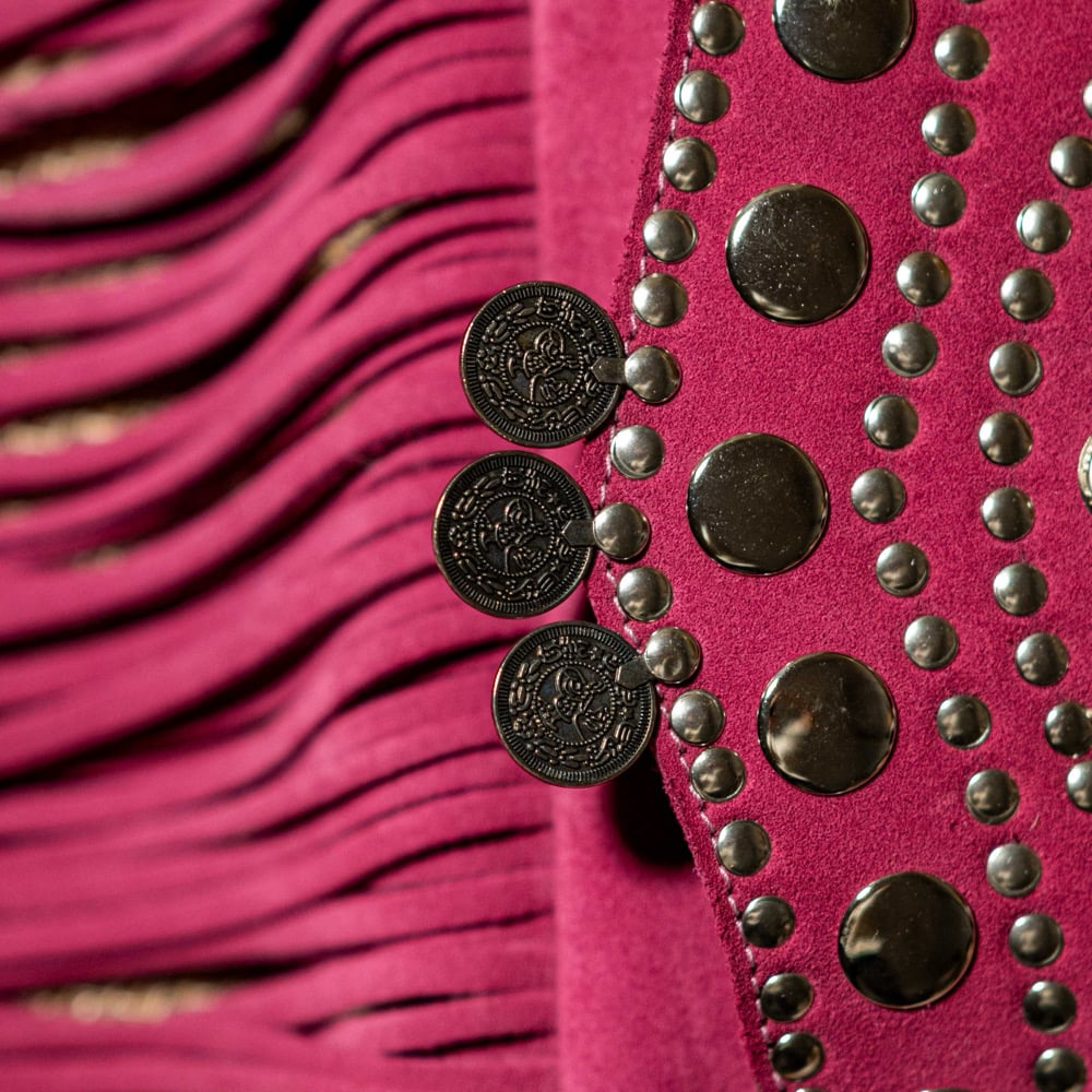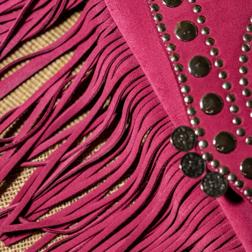 The long, handcrafted fringes add movement and character to every step, making the bag the focal point of any outfit. The edges are defined by a double row of burnished metal studs, adding a bold, Western-chic touch to the overall aesthetic.