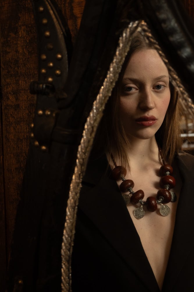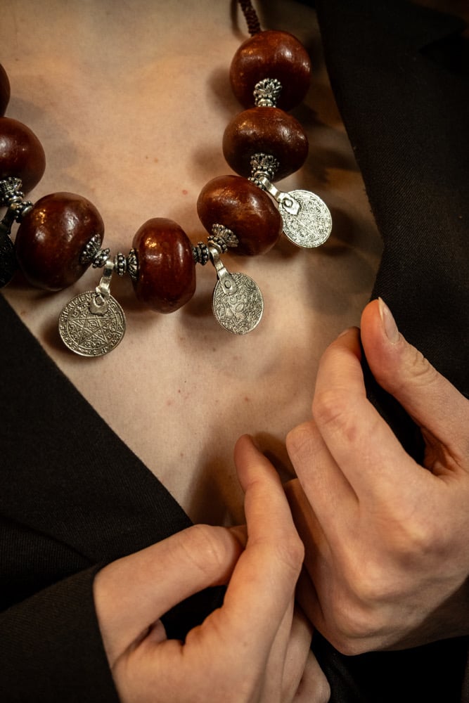 The necklace is composed of large, dark reddish-brown wooden beads.