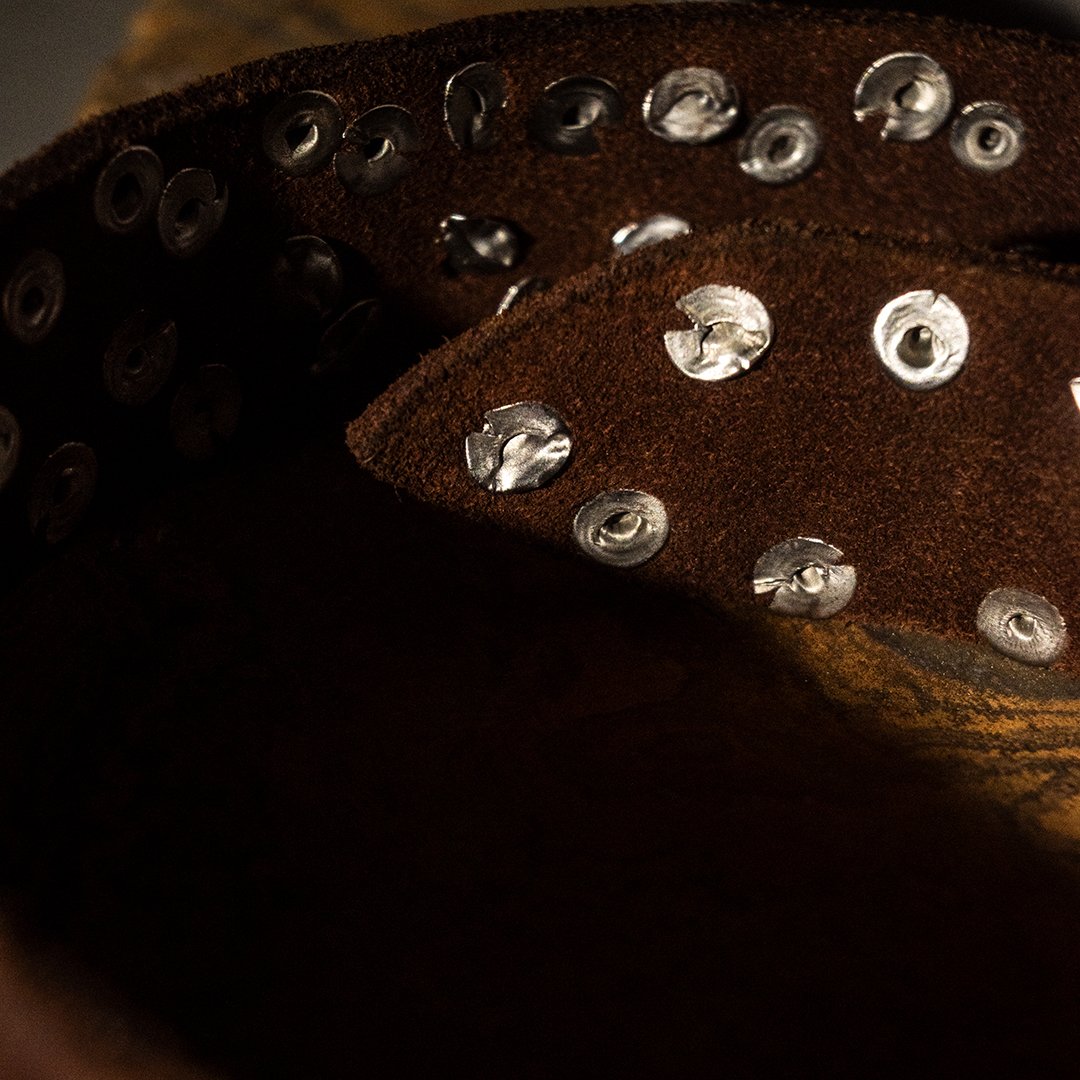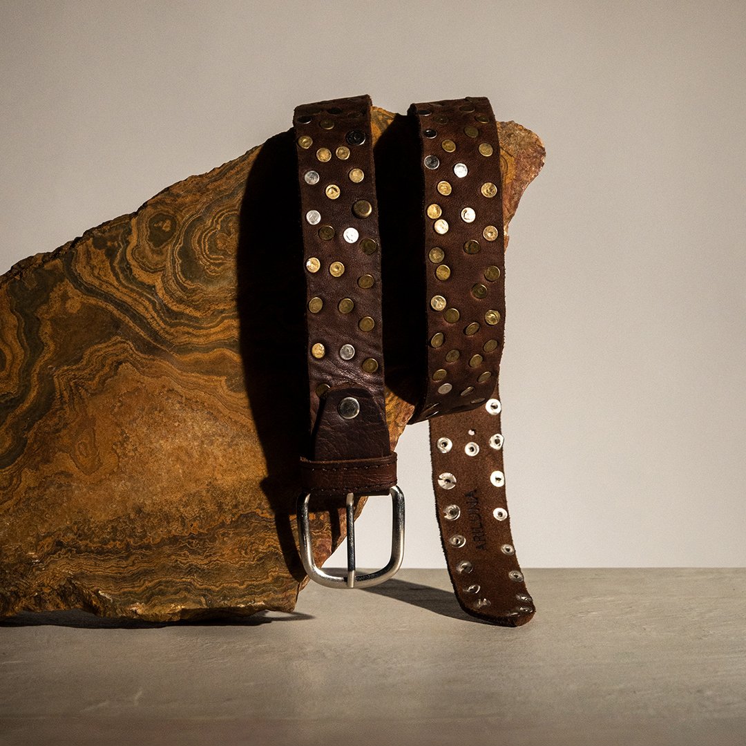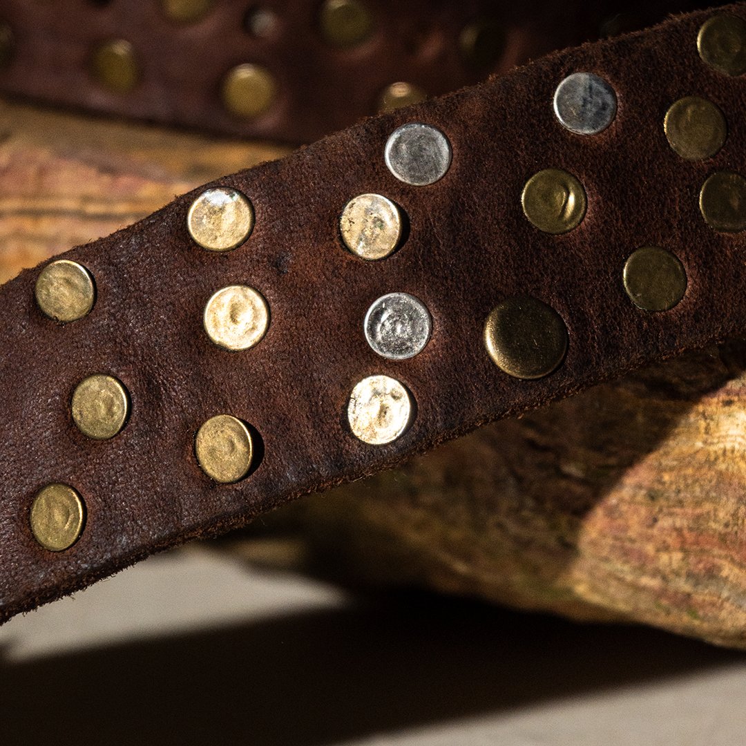 Add character and personality to your outfits with this genuine brown leather belt, embellished with vintage-finish metal studs. Crafted from soft and durable leather, it features a sleek silver-tone metal buckle that enhances its timeless style.