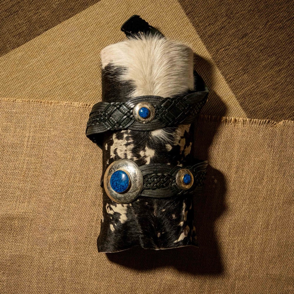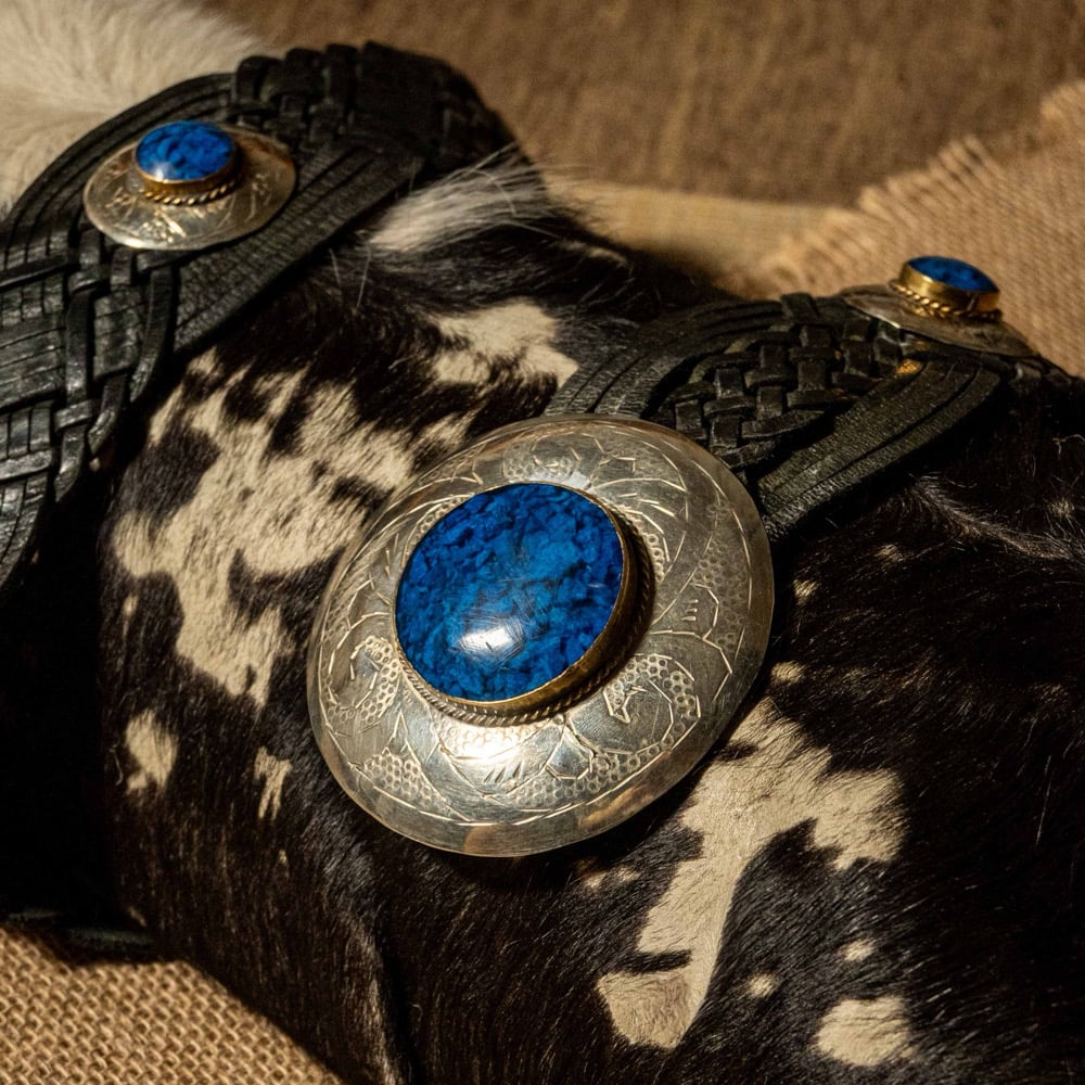 Precious Appliqués: Decorated with large, vintage-style silver conchos, embellished with central lapis lazuli stones that add a vibrant, elegant touch of color.