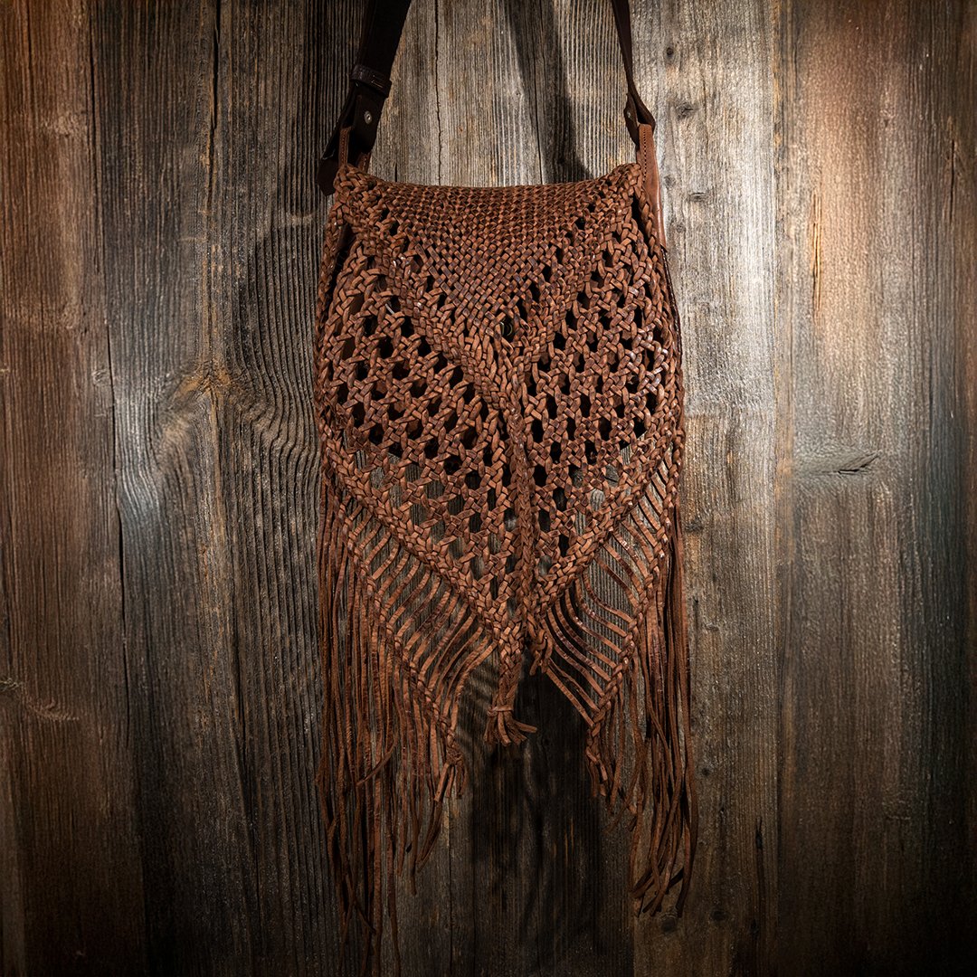 A handcrafted woven leather bag, entirely handmade with a process that makes each piece unique. The soft structure and woven pattern create a three-dimensional effect with a boho and authentic feel. The flap design is embellished with long fringes on the sides and bottom, adding movement and personality to every step.