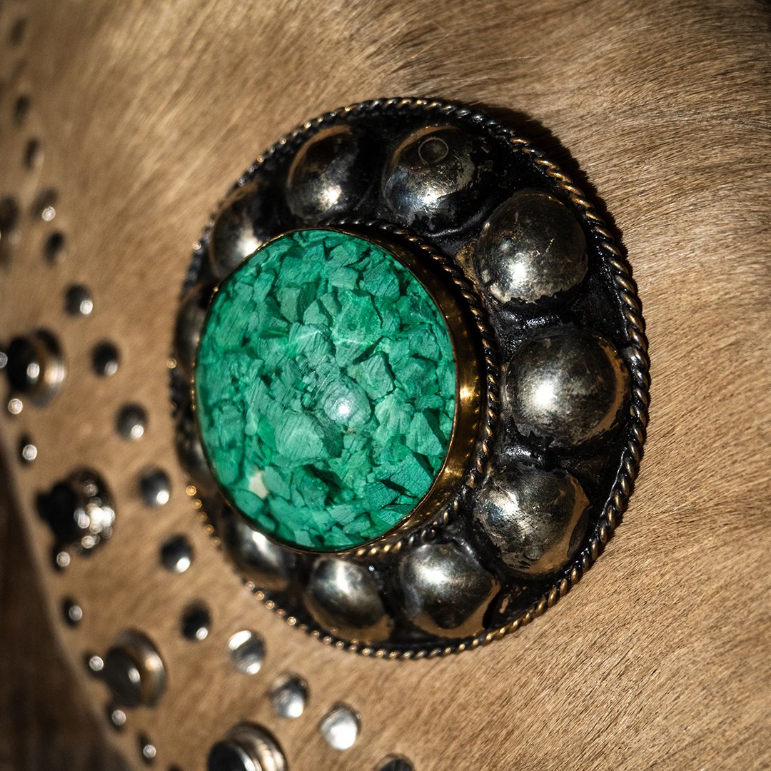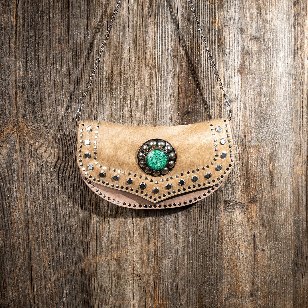 At the center of the flap, a large decorative medallion with a crackled turquoise stone stands out, set and surrounded by metal elements that recall boho-chic and luxury Western aesthetics. The combination of natural materials and metal details makes this bag a true statement piece, capable of transforming any outfit.
