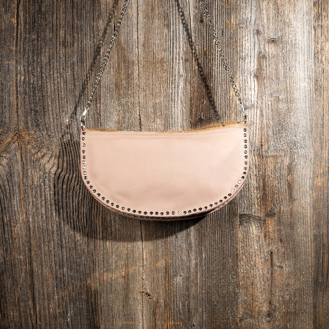 A uniquely handcrafted bag made of genuine leather with natural fur in a sand tone. The soft, asymmetrical shape is enhanced by a rich application of metal studs along the edge, defining its profile with a bold, contemporary touch.